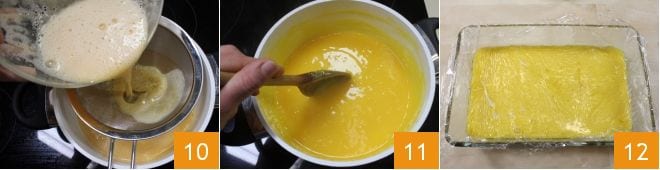 Transfer the obtained mixture into a pot, passing it through a sieve first to remove any lumps 10. Cook the cream over low heat, stirring constantly until it thickens 11 (this will take about 15 minutes). Remove from heat and let the cream cool, covered with a sheet of plastic wrap in contact in the refrigerator 12.