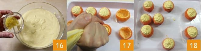 Finally, add the grated zest of one lemon, mix, and cover with a sheet of plastic wrap always in contact. Let the cream rest in the refrigerator for about 3 hours: it should become thick and compact. Transfer it into a pastry bag with a star tip, take the frozen peels out of the freezer, remove the plastic wrap, and fill them with the cream 17, forming a nice final tuft 18. Decorate with the cap and place your stuffed mandarins in the freezer until 20 minutes before serving!