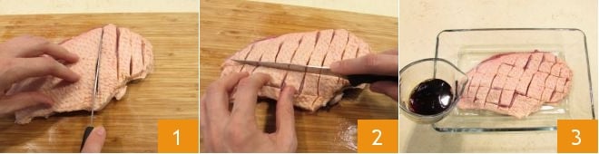 To prepare the marinated duck breast with vegetables, remove the small feathers still attached to the duck breast skin using kitchen tweezers. Score the breast on the skin side by making diagonal 1 and cross-cut slits to create diamonds 2. Now prepare the marinade, place the duck in a bowl and pour the soy sauce over it 3.
