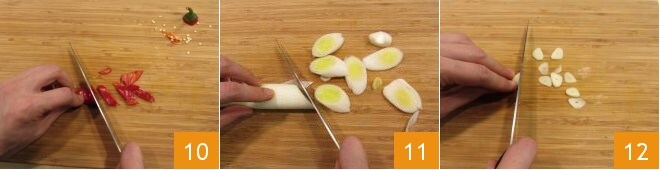 Perform the same procedure with the chili peppers 10. Clean the leek by removing the base and the outer leaves, then slice the white part 11. Peel the garlic and slice it 12, remove the outer leaves and the green part of the lemongrass and cut it in half.