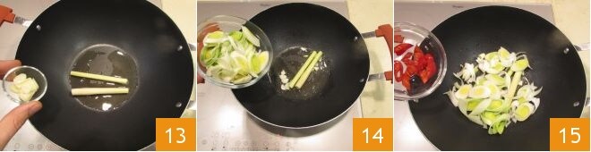 In a wok, heat the sesame oil, then add the lemongrass stalk, sliced garlic 13, leek 14, and chili pepper 15.