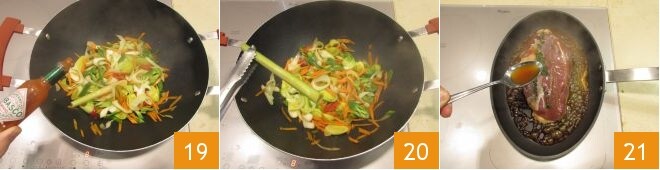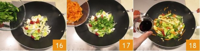 Add the friggitelli 16 and carrots 17, then deglaze with soy sauce 18.