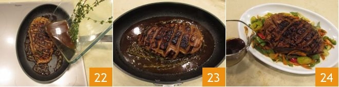 Sear the duck breast on both sides, then pour the remaining marinade into the pan 22 and bake in a preheated static oven at 320°F for 30 minutes (If you don't have an ovenproof pan, you can transfer the breast with its cooking juices to a baking dish suitable for the oven). Once cooked, remove the marinated duck breast from the oven 23 and serve it accompanied by sautéed vegetables and cooking juices 24.