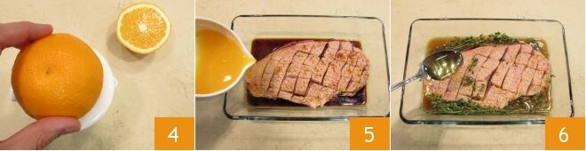 Squeeze the juice of an orange 4 and add it to the meat marinade 5, then flavor with thyme sprigs, honey 6, and pepper.