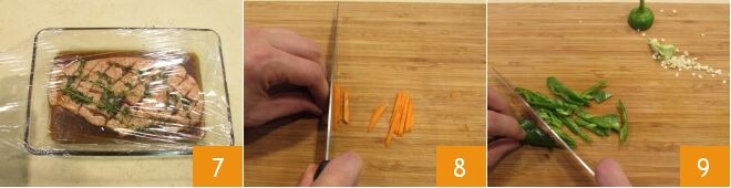 Cover with plastic wrap 7 and let the meat marinate for 2 hours in the refrigerator. Wash and peel the carrots and cut them into thin strips 8, remove the stem and seeds from the friggitelli, then cut them into strips as well 9.