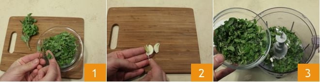 To prepare marjoram pesto, start by rinsing and drying the marjoram, then detach all the leaves from the stem 1; then peel the garlic, cut it in half, and remove the core, which is the central part and is very intense 2. Then put the marjoram leaves into a mixer 3.