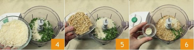 Then add the grated cheese 4, the pine nuts 5, and also the clove of garlic previously cut in half and deprived of its core 6.