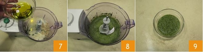 Finally, pour in the extra virgin olive oil and salt 7 and blend until you get a smooth sauce 8. Transfer the marjoram pesto into a container and use it immediately 9.