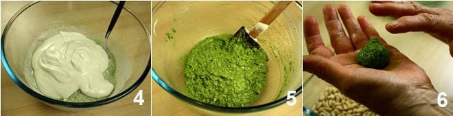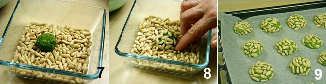 Roll the balls in a container where you have placed the pine nuts (7-8). Place the cookies on a baking sheet lined with parchment paper 9 and bake the Matcha tea cookies in a preheated oven for about 15 minutes at 338°F.