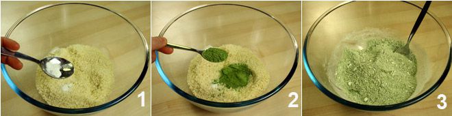 The first thing to do to prepare the two-clock cookies is to beat the egg whites until stiff with half of the sugar. Then finely chop the toasted almonds in a mixer 1, put them in a bowl, and mix them with the remaining sugar. Add the seeds of a vanilla pod and the Matcha tea 2, mix well 3 and add the beaten egg whites 4.