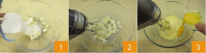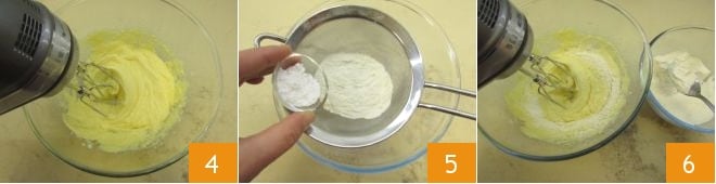 To prepare the matcha tea pound cake, place the softened butter at room temperature and sugar in a large bowl 1 and work with an electric whisk at medium-low speed until the mixture becomes creamy 2; in this case, it is not advisable to use a stand mixer because the volume of the ingredients is very small. Pour the eggs into the bowl one at a time while the electric whisk is running, allowing time for the first egg to be completely absorbed by the mixture before adding the next one 3;