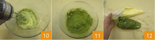 Work this dough with the electric whisk 10 until the matcha tea is fully absorbed and incorporated, achieving a uniform green color 11. Transfer the white and green dough into two separate disposable piping bags 12.