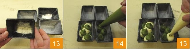 Grease and flour 4 pound cake molds measuring 3.75 x 2.5 x 1.57 inches 13. Take the two piping bags, cut the tip, and squeeze dollops inside a mold to create a layer of green color 14 and a white one 15;