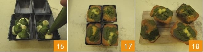 create a final layer with green dough dollops: it is not necessary to fill the molds evenly because during baking the dough dollops will spread and join together, creating a marbled effect 16. Proceed in this way for all 4 molds. Bake the pound cakes in a preheated static oven at 356°F for about 30 minutes. After the baking time, check with a toothpick that the inside of the mini pound cakes is cooked, then remove them from the oven and let them cool in the molds 17; once cooled, you can unmold them (to release them more easily you can use a knife blade around the perimeter of the mold). Your matcha tea pound cakes are ready to be served 18!