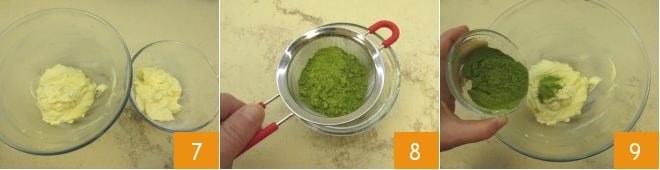 When all the ingredients are well combined, divide the dough into 2 portions weighing 10.58 oz and 5.29 oz in 2 separate bowls 7. Now, in a separate small bowl, sift the matcha tea powder with a fine mesh strainer 8 and add it to the bowl with the 10.58 oz dough 9.