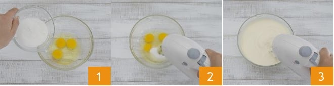 To prepare the matcha tea roll, first make the sponge cake. Crack the eggs into a bowl, add 80 g of sugar 1 and whip the mixture with electric beaters 2 until it is thick and foamy 3.