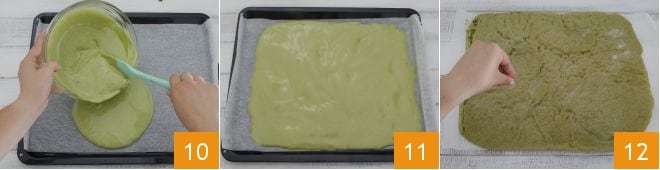 Pour the mixture onto a baking tray lined with parchment paper measuring 12x16 inches 10. Gently level the surface 11 and bake in a preheated static oven at 350°F for about 8 minutes. Once baked, remove the sponge cake from the oven and transfer it to the work surface, being careful not to burn yourself. Sprinkle the surface with granulated sugar 12, then flip it over and gently remove the parchment paper.
