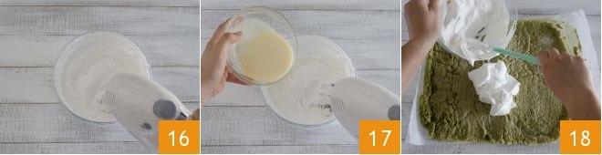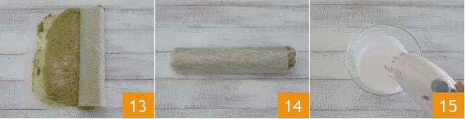 Roll up the sponge cake in the parchment paper 13, then wrap it in plastic wrap 14 and let it rest. In the meantime, prepare the milk cream: pour the cold heavy cream into a bowl and start whipping it with beaters 15,