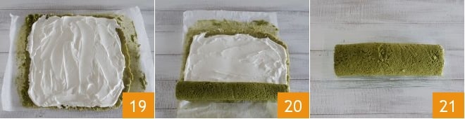 Then spread it evenly 19 and roll up the cake from the shorter side 20. If necessary, you can trim the edges of the cake before rolling it. Place the roll in the refrigerator for at least an hour before serving it 21.