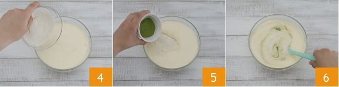 Add the flour 4 and matcha tea 5. Then incorporate the powders with a spatula, mixing from the bottom to the top 6,