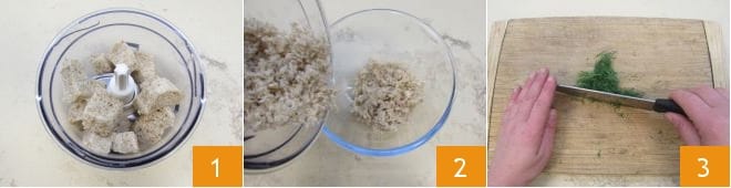 To prepare the sesame crusted meatballs, cut the whole wheat bread crumb into cubes, removing the outer crust, and crumble it in a food processor with blades (1-2). Finely chop the dill and set it aside 3.