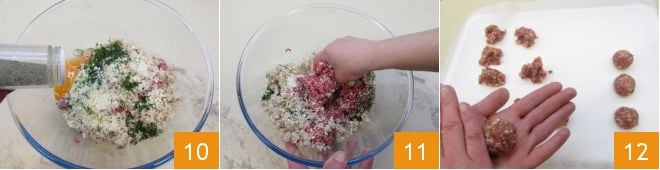 Pepper to taste 10 and mix with your hands until you get a homogeneous mixture 11. At this point, shape the mixture into meatballs of about 0.7 oz each 12, and continue this way until the mixture is used up: with our quantities, you should get 38 meatballs.