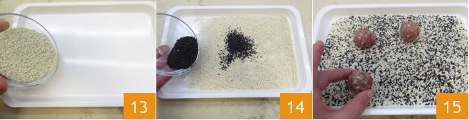 Pour the white sesame seeds into a tray 13 and mix them with the black sesame seeds carefully 14. Roll the meatballs in the sesame, making sure it adheres well to the meat 15.