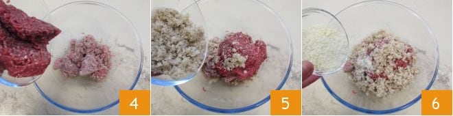 In a large bowl, pour the ground pork and beef 4, mixing them with your hands; add the crumbled bread 5, then the grated cheese 6.