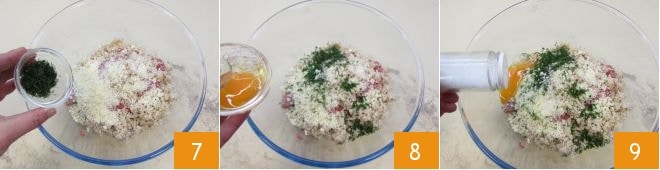 Season the mixture with the chopped dill 7, then incorporate the egg 8 and adjust the salt 9.
