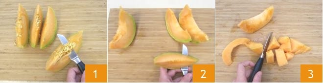 To prepare the melon shots with feta bundles, start by cleaning the melon. Cut the melon into wedges and remove the seeds and inner filaments 1. Then, run the knife between the rind and the flesh to peel each slice 2 and finally cut the flesh into large chunks 3.