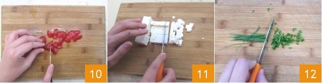 Finally, slice the strips into cubes 10. Set them aside and move on to the feta. First, cut it into strips and then into cubes 11 about the same size as the cherry tomato cubes. Finely chop the chives 12.