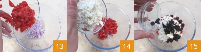 In a large bowl, pour in the onion, cherry tomatoes 13, feta 14, and sliced olives 15