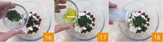 And the chives 16. Season with oil 17 and a pinch of salt 18: not much is needed as feta is quite salty on its own.