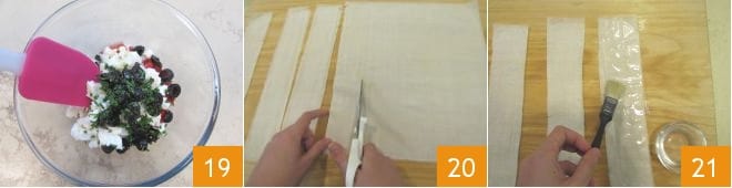 Mix well to combine the ingredients 19 and set aside. Then lay two sheets of filo pastry measuring 18x13 inches one on top of the other, placing them on the working surface with the long side at the base. Using a pair of scissors, cut 8 strips that are 2.5 inches wide 20. Brush the strips with a bit of water to rehydrate them 21.