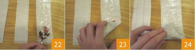 Place a small spoonful of filling at the base of the filo strip 22, and fold one end to create a triangle enclosing the filling 23. Fold the same way with the newly formed triangle along the strip 24