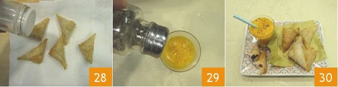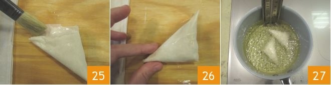 and continue this way until you reach the end of the strip. Brush the last flap with a bit of water 25 before folding it to seal your bundle 26. Repeat this process for the other 7 bundles, then repeat with the other 2 sheets of filo pastry to make the remaining 8 bundles. In total, you will have 16. Heat the seed oil in a deep pan, and when it reaches a temperature of 340-355°F, immerse a couple of bundles at a time, frying them 27 for about half a minute on each side until golden brown.