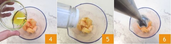 Place the melon chunks in the blender cup and add the oil 4 and a pinch of salt 5. Using an immersion blender, blend thoroughly 6