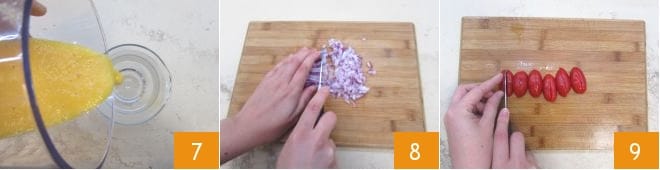 And then transfer the obtained puree into a pitcher 7. Place the pitcher in the fridge to keep your melon smoothie chilled. In the meantime, focus on the bundles, starting with the filling ingredients. Finely chop the red onion 8 and set it aside. Cut the cherry tomatoes in half lengthwise and slice them into strips 9.