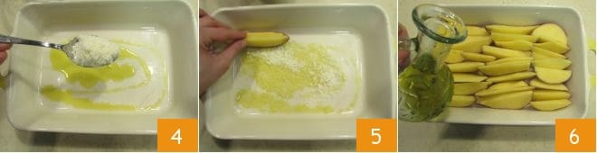 Now take a 13.4x7.9 inch (34x20 cm) baking dish, grease the base with a drizzle of olive oil and sprinkle it with part of the grated Grana Padano 4. Arrange the potato wedges in the baking dish with the skin side down 5, until the base is completely covered. Season with a drizzle of oil 6,