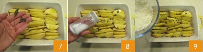 thyme leaves 7, salt 8, and pepper, and bake in the preheated static oven at 428°F (220°C) for 40 minutes on the middle rack. After this time, remove the baking dish from the oven and sprinkle the potatoes with the grated provolone that you had set aside 9