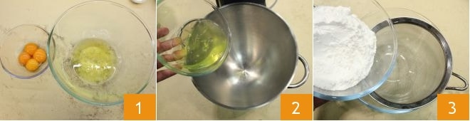 To prepare tricolor meringues, start by making the French meringue (basic dough). Begin by separating the yolks from the whites, then pour them into a stand mixer or a tall-sided container 1. Pour the egg whites into a stand mixer fitted with a whisk or into a tall-sided bowl 2 and start whipping at medium speed. Meanwhile, sift the powdered sugar into a separate bowl 3.