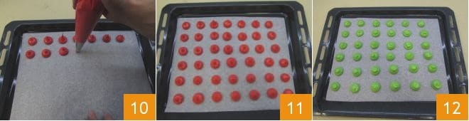 At this point, take a baking sheet and line it with parchment paper. Pour the colored meringue mixtures into two different piping bags fitted with plain nozzles; start with one and pipe small meringue buttons with a diameter of 0.8 to 1.2 inches 10, spacing them apart. You should obtain 30 small meringues. Repeat the operation for the other piping bag. Bake in a preheated static oven at 194°F for at least 3 hours, ensuring that you leave the oven door slightly ajar to allow as much moisture as possible to escape. Once dried 12, remove and let cool.