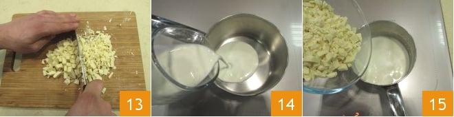 Meanwhile, proceed with making the white chocolate cream. On a cutting board, chop the white chocolate 13. Then pour the cream into a saucepan and bring to a boil 14. When it reaches the boiling point, remove the saucepan from the heat and add the chopped chocolate 15, continuing to stir with a spatula to melt the chocolate and avoid lumps. Then transfer the cream to a small bowl. Cover it with plastic wrap to prevent a skin from forming and let cool at room temperature. Once it reaches room temperature, transfer your cream to the refrigerator for at least 1 hour.