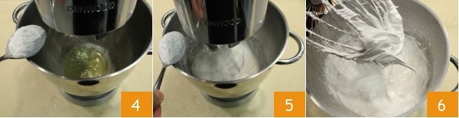 Gradually add 110 g of powdered sugar, a little at a time, and continue whipping 4. When the egg whites are well whipped to stiff peaks, proceed by incorporating the remaining powdered sugar, one tablespoon at a time 5, ensuring that you add a tablespoon of powdered sugar only when the previous one has been fully incorporated until you get a white and fluffy meringue 6.