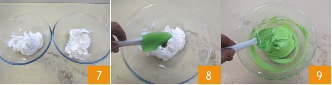 Then divide the obtained mixture equally into two small bowls 7. In one, add 1 g of green food coloring 8: mix well with a spatula to make the color uniform 9. Repeat the operation with the red food coloring.