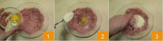 To prepare the Milanese-style cone, start with the meatballs. In a bowl, add the veal ground meat along with the eggs 1, salt, pepper, and Grana Padano cheese 2. Mix everything well until all ingredients are combined 3.