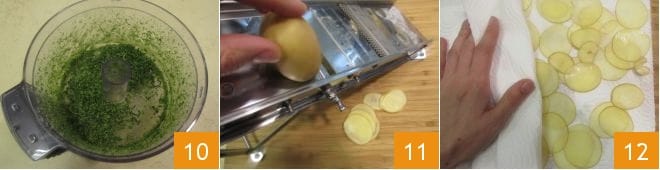 Blend until obtaining a grainy mix; set it aside 10. Wash and dry the potatoes, then slice them thinly with a mandoline to get slices about 0.08 inches thick 11. Drain on a paper towel and gently pat dry 12.