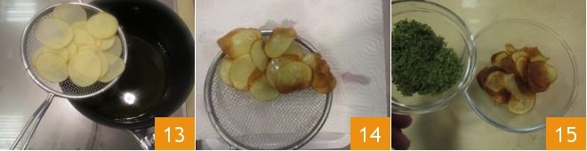Next, heat plenty of oil in a large pot and immerse the chips when the oil reaches 340°F 13, let them brown for a couple of minutes, then drain on a paper towel 14. Garnish with the mix and set aside 15.