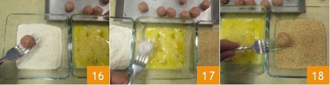 At this point, take the meatballs from the fridge and coat them first in flour 16, then in beaten eggs 17, and finally in breadcrumbs 18.