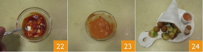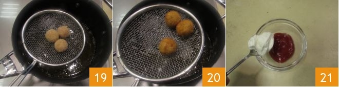 Proceed to fry the meatballs in the hot oil, still at 340°F, for about a couple of minutes 19 and drain them once they are golden 20. Finally, prepare the dipping sauce by mixing ketchup in a small bowl with a few drops of Tabasco and Greek yogurt 21.